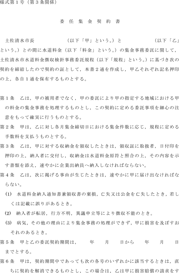 第1条 この規程は,地方公営企業法(昭和27年法律第292号。以下「法」という。)第21条第1項,第33条の2並びに地方公営企業法施行令(昭和27年政令第403号。以下「政令」という。)第26条の4の規定に基づき,土佐清水市水道料金徴収並びに検針事務を委託することに関し必要な事項を定める。