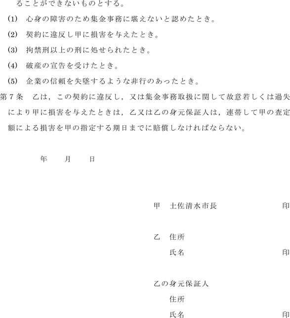 3 市長は,第1項の規定により料金の徴収事務の委託を受けた者(以下「集金人」という。)に対して保証人1名以上をたてさせるものとする。
