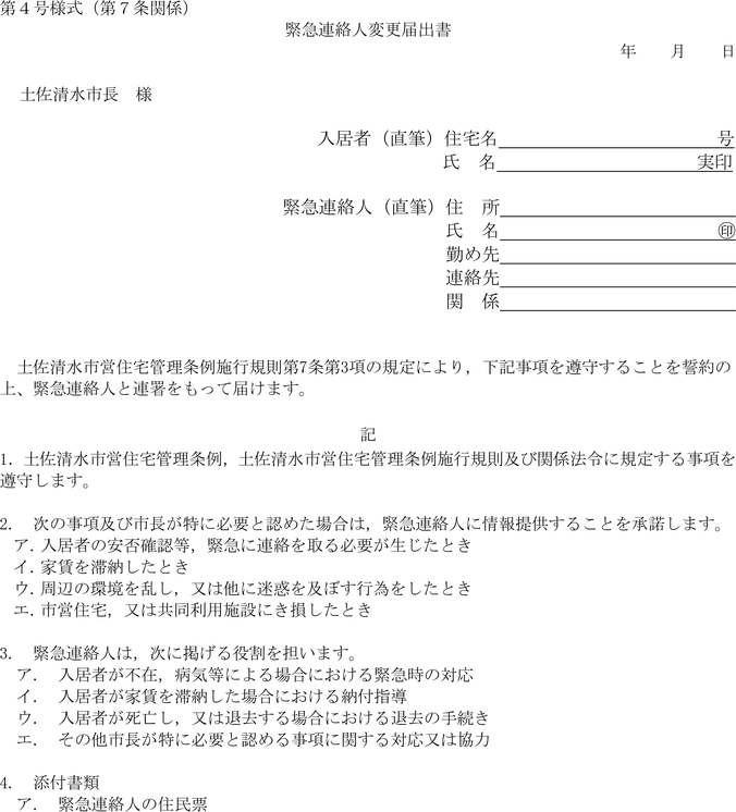 別記第4号様式による緊急連絡人変更届出書を速やかに届け出なければならない。