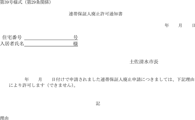 別記第18号様式による市営住宅同居承認書により,同居の承認をしないときはその旨を書面により当該申請をした者に通知するものとする。