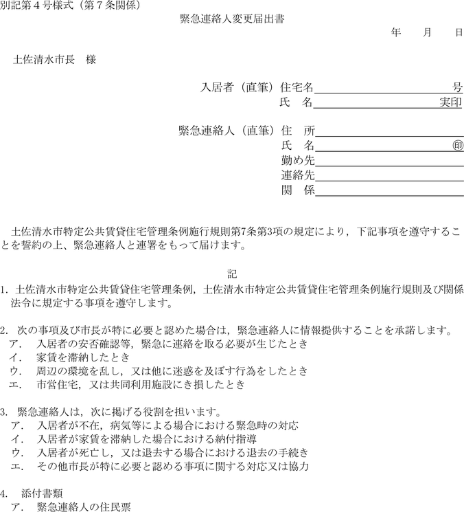 別記第4号様式による緊急連絡人変更届出書を速やかに届け出なければならない。