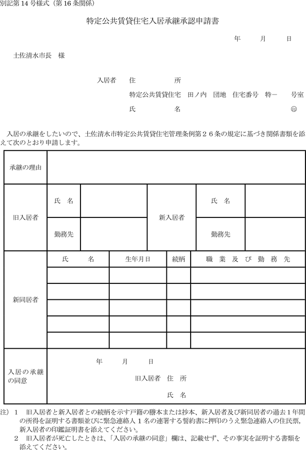 別記第14号様式による特定公共賃貸住宅入居承継承認申請書を市長に提出しなければならない。