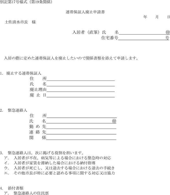 2 連帯保証人を立てている入居者は,前項の規定により既に設けた連帯保証人を廃止しようとするときは,別記第38号様式による連帯保証人廃止申請書を市長に提出しなければならない。