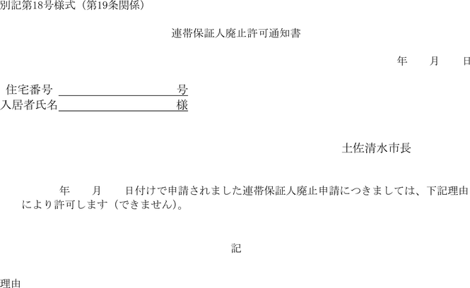 3 市長は,連帯保証人廃止申請書の提出があったときは,審査の上,その可否を決定し,別記第39号様式による連帯保証人廃止許可書にて当該申請者へ通知するものとする。